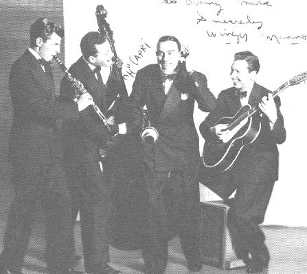 (Formation Wingy MANONE : De gauche à droite : Joe MARSALA (cl), Sid WEISS (b), Wingy MANONE (tp), Carmen MASTREN (g))